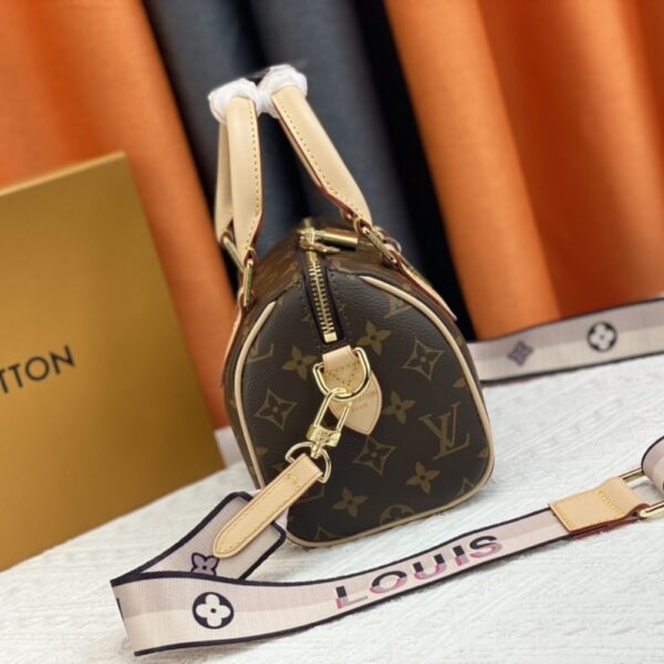 The Speedy Bandoulière 20 hand bag takes on classic Louis Vuitton allure in Monogram canvas with leather trim and gold-color hardware. Inspired by the House’s emblematic travel bag, its distinctive shape is adorned with two rolled-leather top handles, padlock. A detachable two-color strap, signed Louis Vuitton, enables shoulder and cross-body wear.