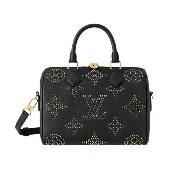 A unique version of the Monogram motif, created with golden studs, brings a rock-and-roll aesthetic to this glamourous Speedy Bandoulière 25 handbag. One of the House’s classic shapes, the Speedy is inspired by the House’s travel bags and features the two rolled-leather top handles as well as the engraved padlock seen on the original.