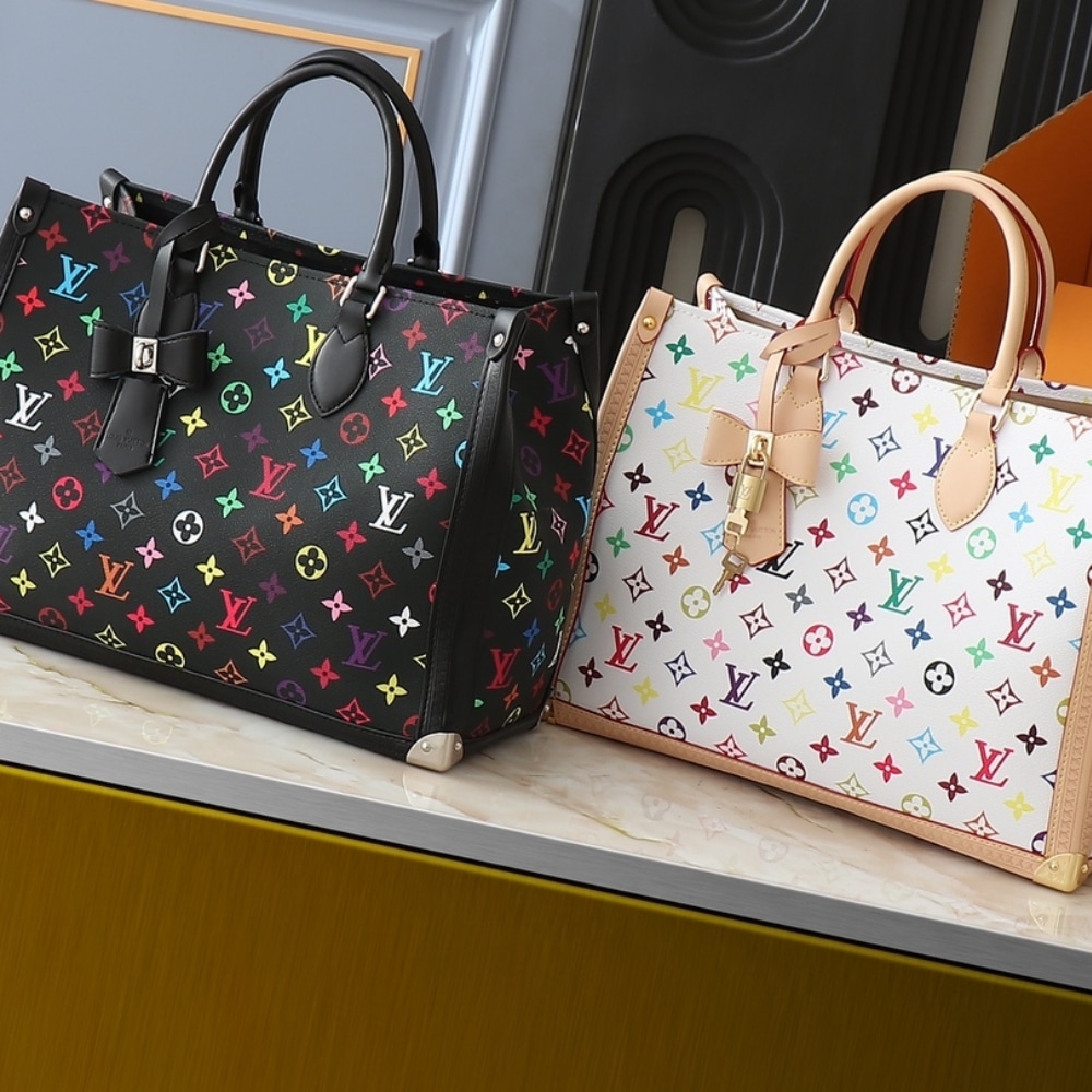The LV x TM On-the-Go Trunk MM is an exclusive, limited-edition version of this iconic bag. Crafted from the Louis Vuitton x Takashi Murakami collection’s Monogram Multicolore canvas and trimmed with the Maison’s signature tanned leather, this vibrant statement piece. The elegant gold-tone corners mimic the details of the Maison’s traditional trunks. The LV x TM key bell adds a touch of elegance to this collaboration’s unique design. The shoulder strap and two top handles allow for versatile carrying.
