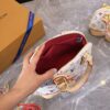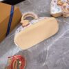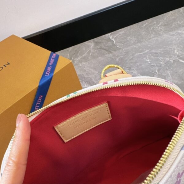 Originally inspired by a 1930s Art Deco design, this edition of the Alma BB has a celebratory spirit in the Louis Vuitton x Murakami collection’s multicolored Monogram coated canvas, which draws on the Japanese artist’s playful palette. The House’s natural cowhide leather adds an emblematic touch to the refined Toron top handles, the bottom, the removable strap, and the exclusive LV x TM keybell.