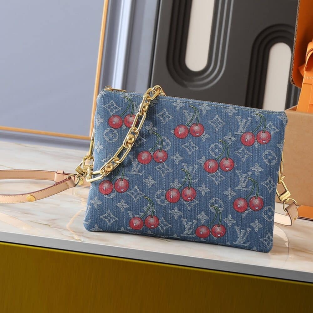 This playful remake of the Louis Vuitton x Murakami Coussin PM bag, a classic from the Louis Vuitton x Murakami collection, is reimagined in denim with a playful Monogram cherry embroidery, perfectly capturing the vibrant and joyful style for which the Japanese artist is renowned. The bag features a detachable gold chain and leather shoulder strap, and the interior is spacious enough for everyday essentials, including a large smartphone.