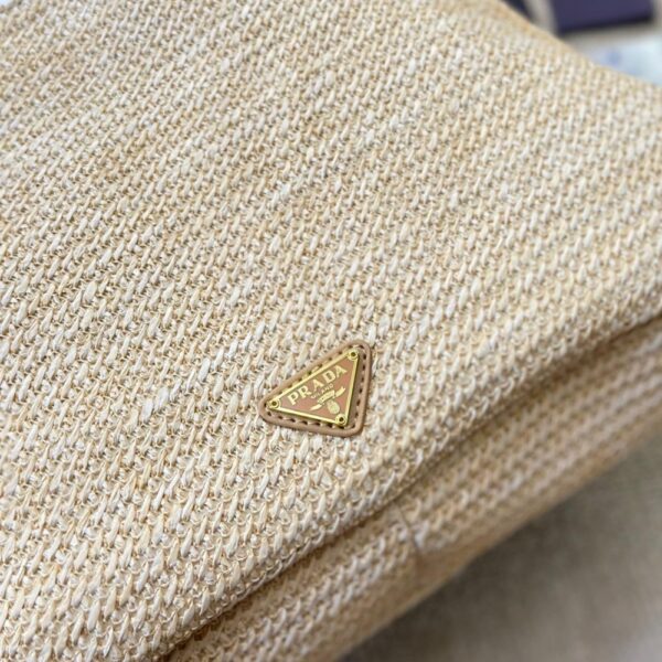 The Prada Logo Embossed Raffia Shoulder Bag in beige exudes effortless sophistication with its chic silhouette and iconic detailing. Designed to embody modern elegance and timeless prestige, it is the perfect statement piece that elevates every ensemble with understated luxury.