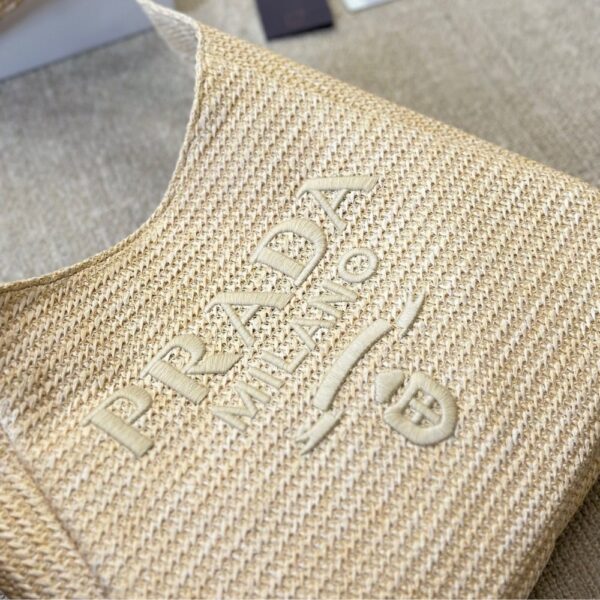 Prada Logo Embossed Raffia Shoulder Bag Beige