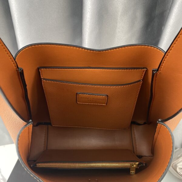 Grained leather and open top with foldover leather strap with gold-tone cassandre hardware. Single main compartment. One interior slip and zipper pockets.