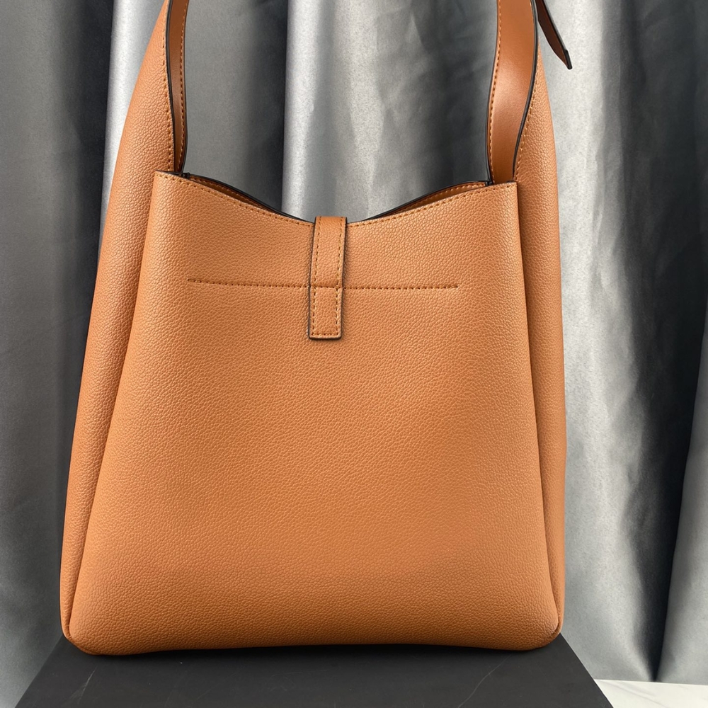Grained leather and open top with foldover leather strap with gold-tone cassandre hardware. Single main compartment. One interior slip and zipper pockets.
