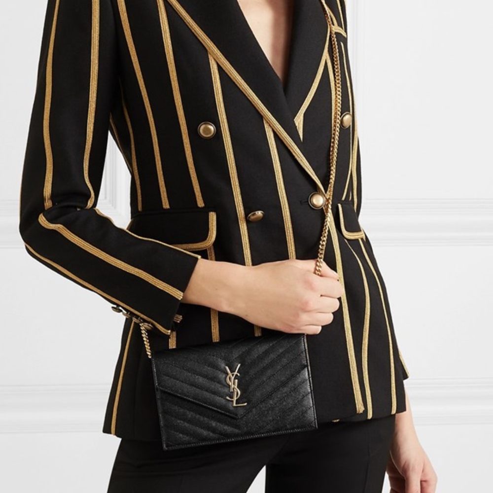 This SAINT LAURENT wallet on chain makes an elegant addition to the accessories selection. It features a front-flap closure with multiple pockets and strap to carry over the shoulder. The classic design is given a distinctive look with the interlocking YSL accent and luxe matelassé stitching.