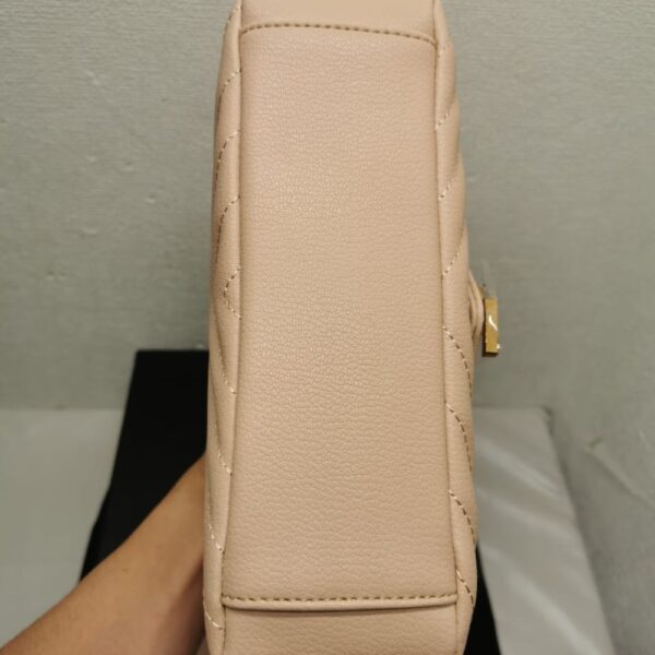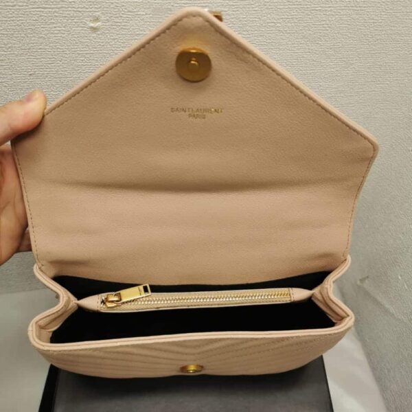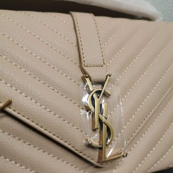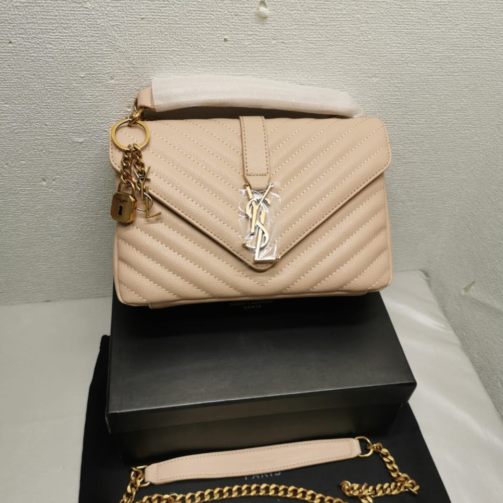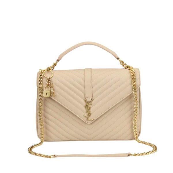 The Saint Laurent College Large Chain Bag Beige 25cm is a timeless piece crafted in quilted leather with the iconic YSL monogram. Featuring a top handle and a removable chain strap, it offers versatile styling as a shoulder or crossbody bag. Its structured silhouette and elegant beige tone make it a refined choice for both day and evening looks.