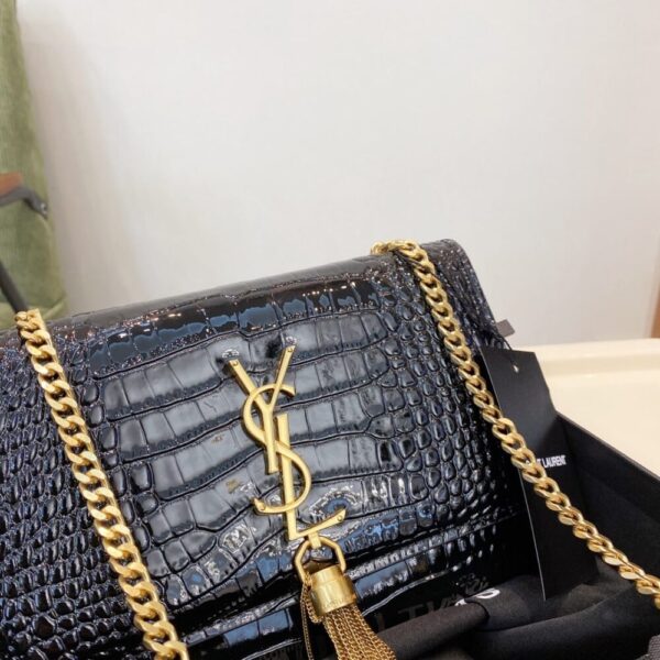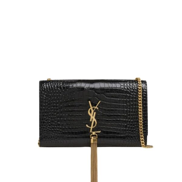 A striking evening bag featuring croc-embossed black patent, the iconic YSL monogram in gold, and an elegant tassel detail. Its compact shape and chain strap make it a timeless statement piece.