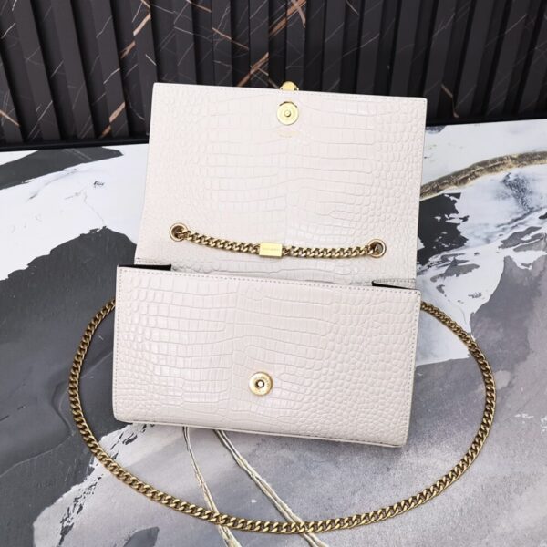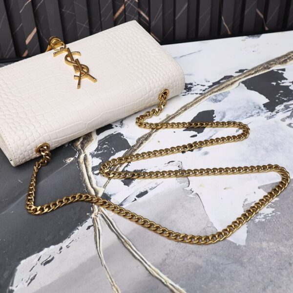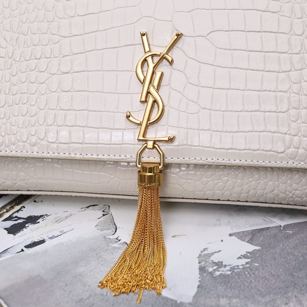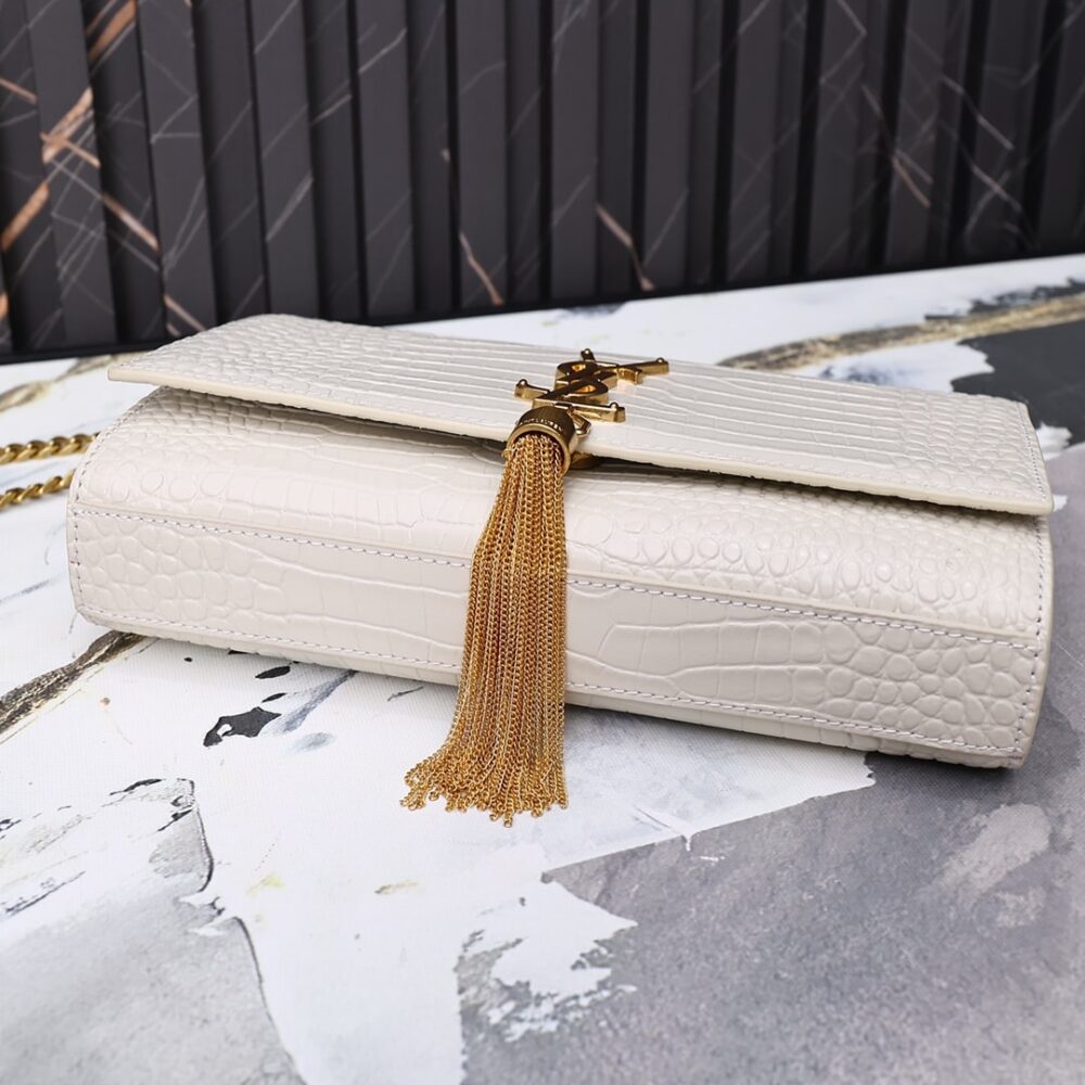 A striking evening bag featuring croc-embossed white patent, the iconic YSL monogram in gold, and an elegant tassel detail. Its compact shape and chain strap make it a timeless statement piece.