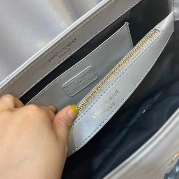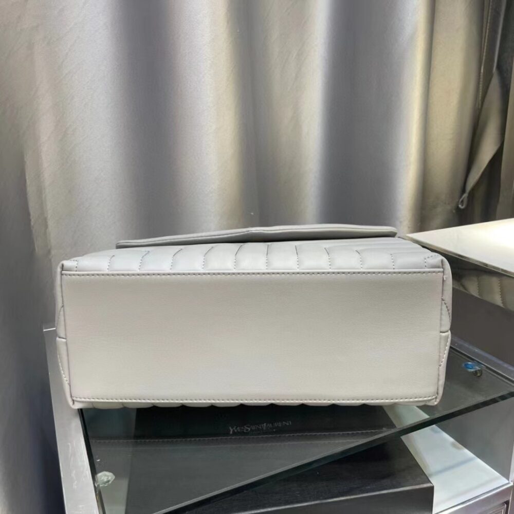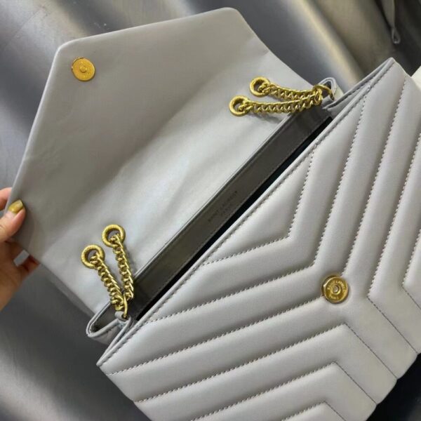 The Saint Laurent Loulou Chain Bag in Matelassé Y Quilted Gray is crafted in supple leather with the house’s signature pattern for a refined silhouette. Spacious yet elegant, this piece embodies modern sophistication and timeless Parisian style.