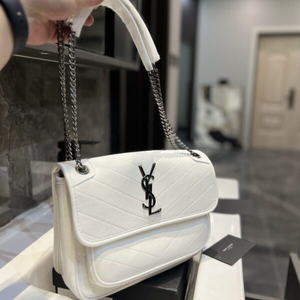 The Bag Saint Laurent Niki Baby Chain Bag, with the iconic initials in leather covered raised metal on the front, this bag continues in the vein of classic French style and simplicity. This Yves Saint Laurent Quilted Crinkle Leather Medium Niki Bag features crinkled leather that can be worn on the shoulder or crossbody. The interior is large enough to fit your small essentials.