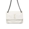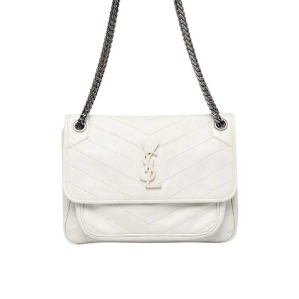 The Bag Saint Laurent Niki Medium In Vintage Leather White, with the iconic initials in leather covered raised metal on the front, this bag continues in the vein of classic French style and simplicity. This Yves Saint Laurent Quilted Crinkle Leather Medium Niki Bag features crinkled leather that can be worn on the shoulder or crossbody. The interior is large enough to fit your small essentials.