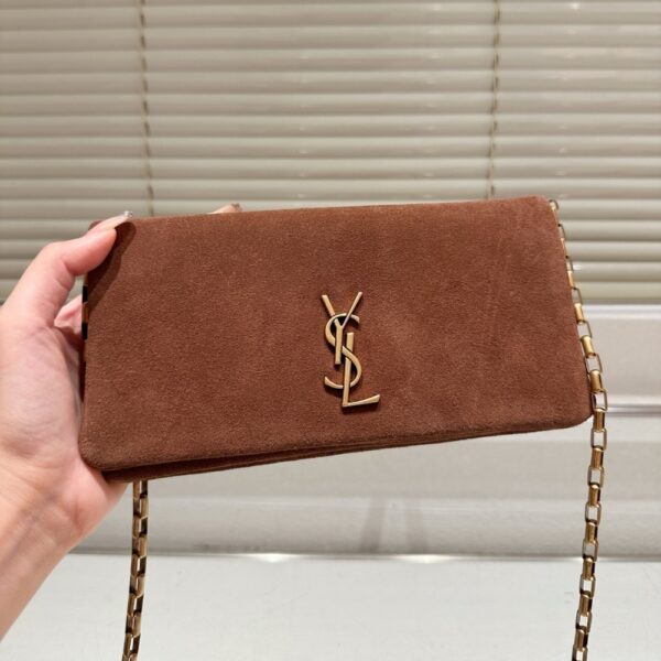 It features a sleek rectangular silhouette with a flap closure, gold-tone YSL monogram logo, and a matching chain strap. The minimal design highlights its refined elegance, perfect for both day and evening wear.