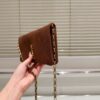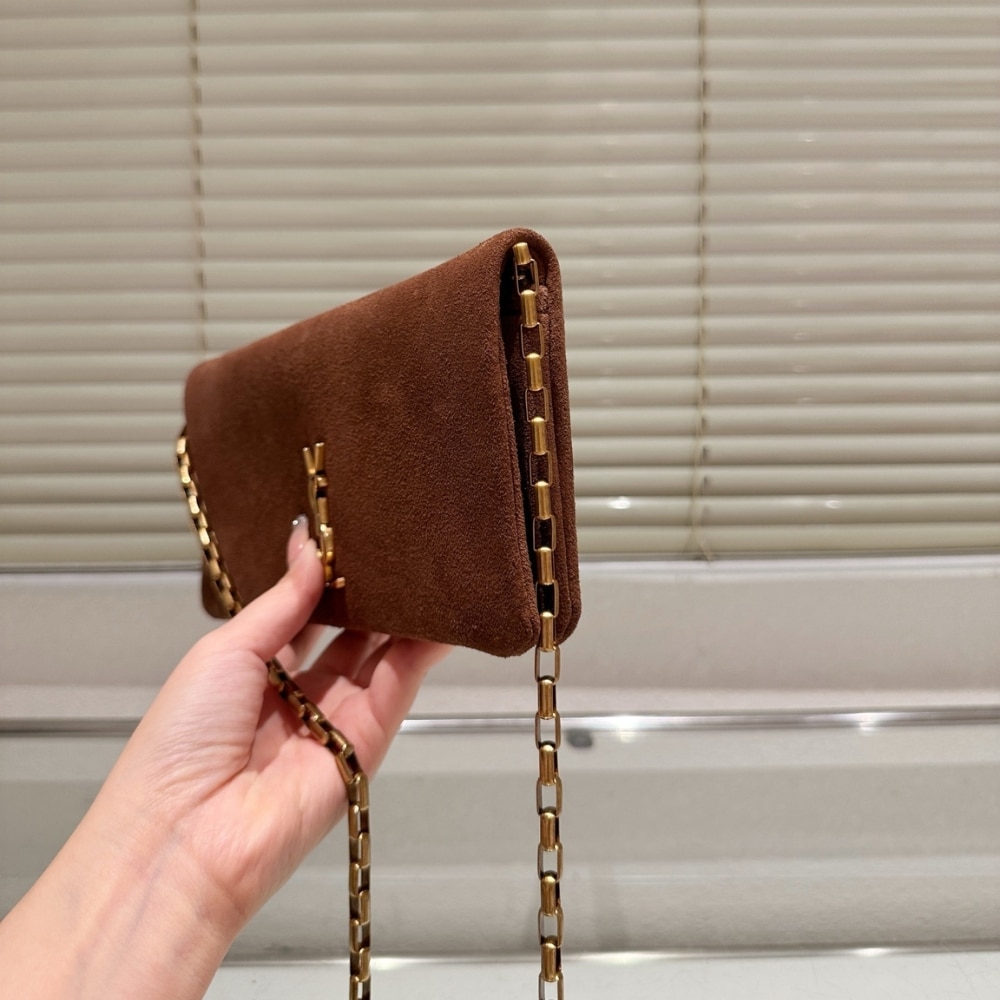 It features a sleek rectangular silhouette with a flap closure, gold-tone YSL monogram logo, and a matching chain strap. The minimal design highlights its refined elegance, perfect for both day and evening wear.