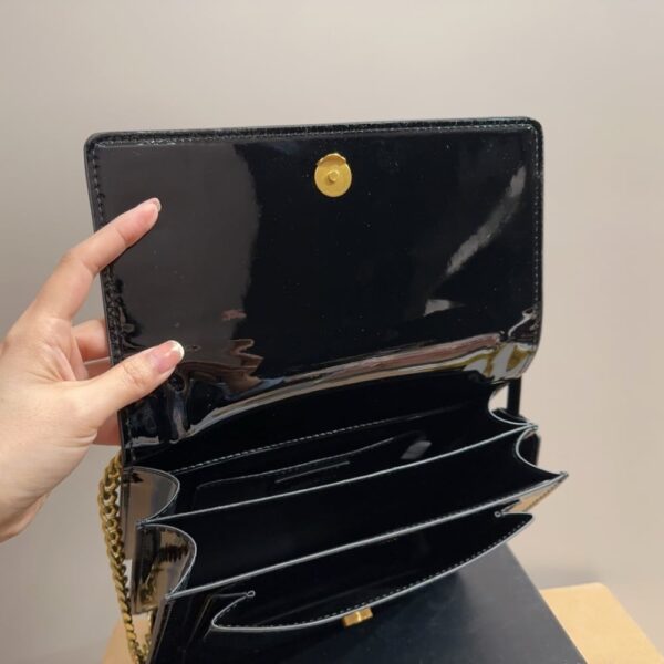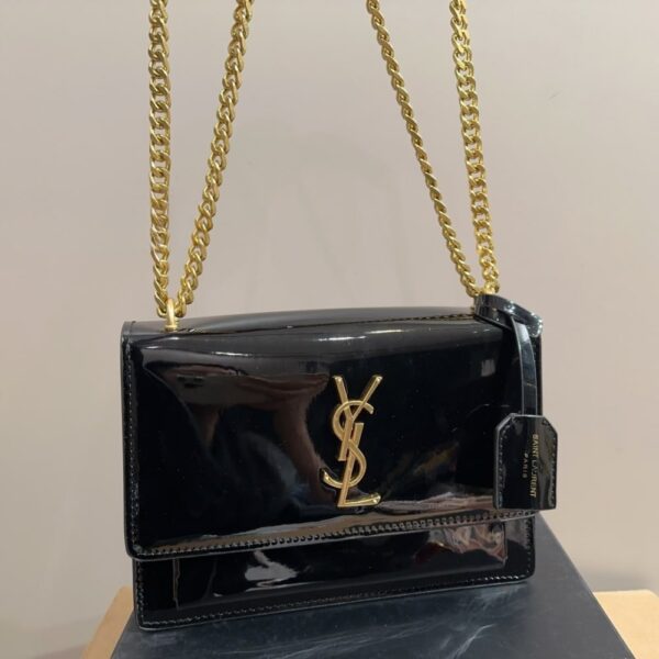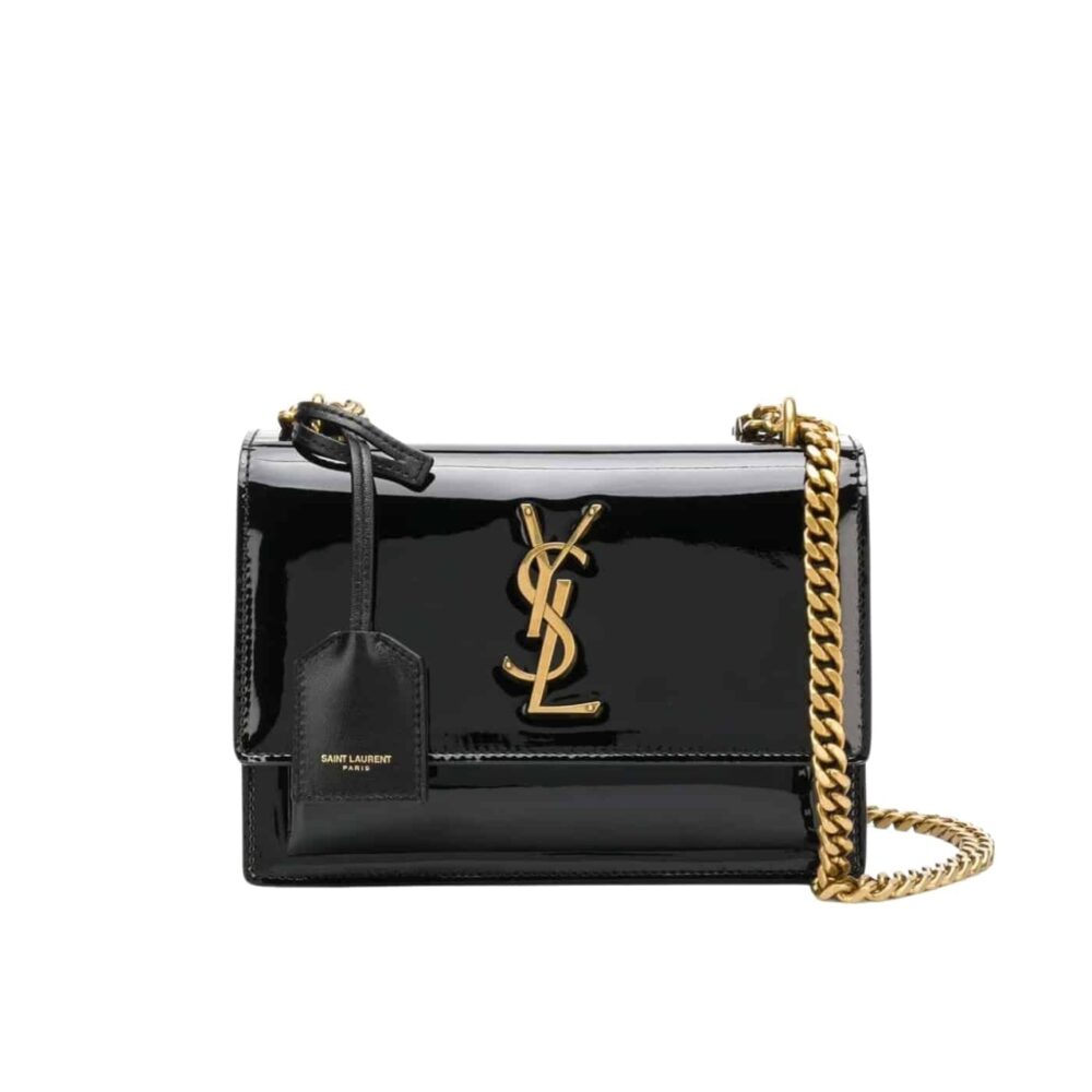 Luxury French fashion house Saint Laurent is famed across the globe for its exquisitely crafted handbags and accessories, each infused with the label’s own glamorous edge. This stunning black Sunset chain wallet has been constructed from patent leather, and features a gold-tone chain shoulder strap, accordion details at sides, a gold-tone logo plaque, a hanging leather tag and a foldover top.